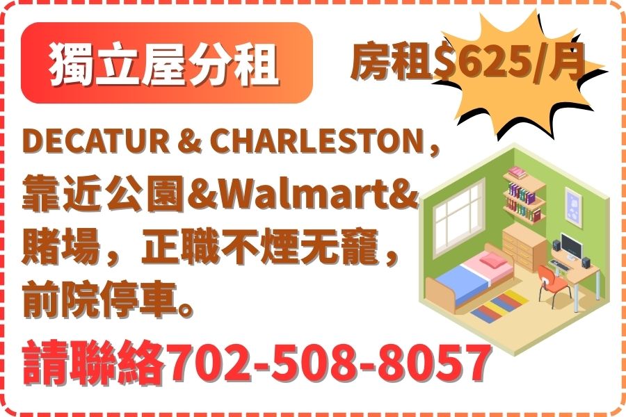 DECATUR & CHARLESTON, 靠近公園&Walmart&賭場, 正職不煙无竉,前院停車。 房租$625/月 |
