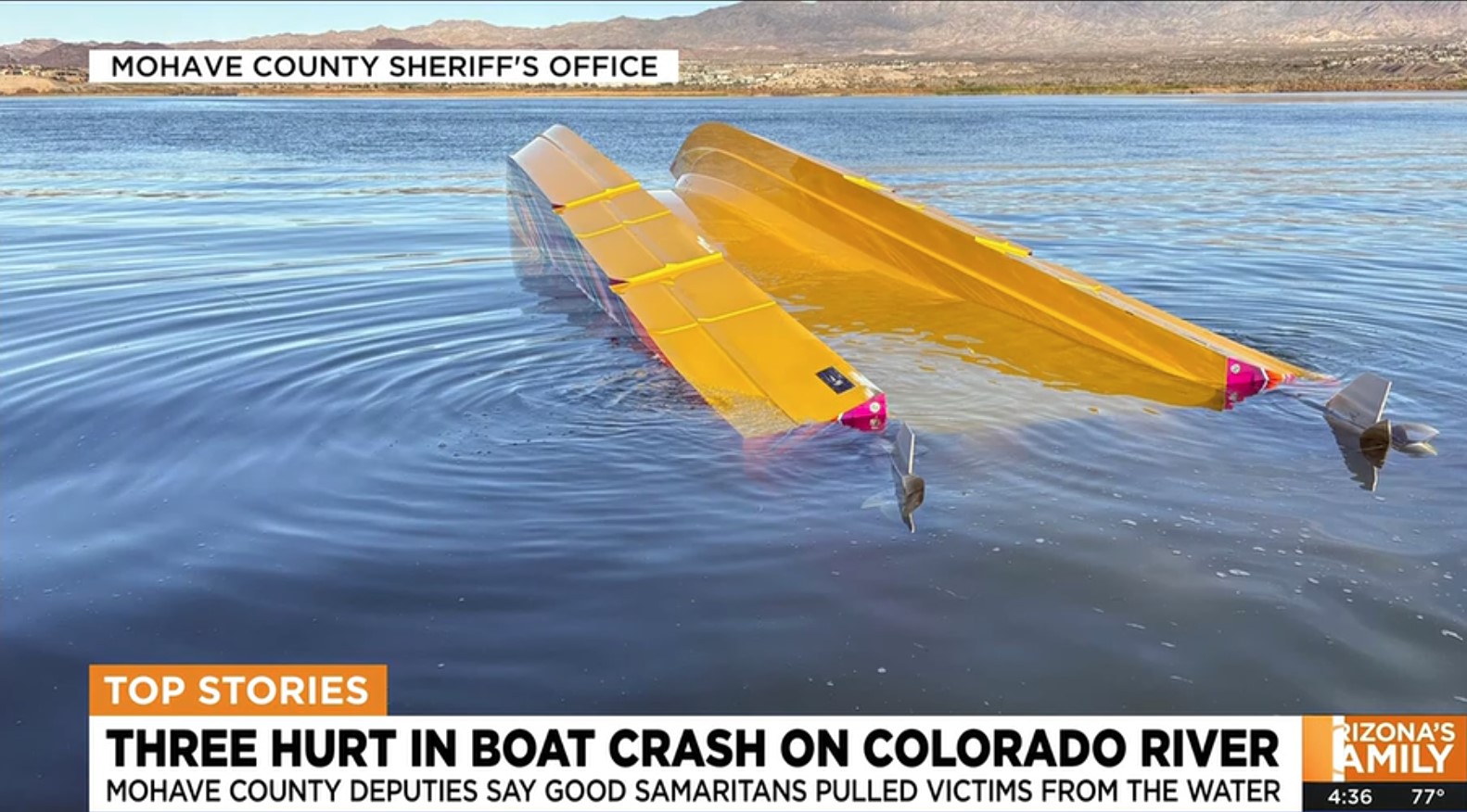 記者晨楓報導, 上週五下午,科羅拉多河(Colorado River)發生一起嚴重的船隻翻覆事故。根據莫哈維郡警長辦公室(Mohave County Sheriffs Office)提供的訊息,事故造成船上三名人員受傷,其中一人傷勢嚴重,目前正接受緊急救治。 初步調查顯示,該動力船隻在高速行駛過程中不慎撞擊了隱藏在水面下的沙洲,強大的衝擊力導致整艘船失控翻覆,船上所有乘客均在瞬間被拋入河中。救