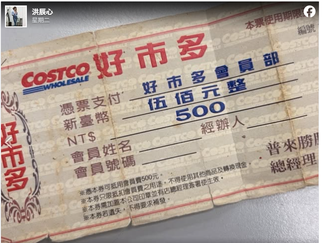 原PO昨(21)日於臉書社團發文指出,在好市多排隊結帳時,目睹前方會員拿出一張20年前的500元抵用券,用來支付續約會員費。她觀察到對方拿出抵用券時,顯得有些緊張,猜測可能擔心會被拒收,但櫃檯人員確認後順利完成折抵,讓原PO驚呼「結果真的可以用欸」。
