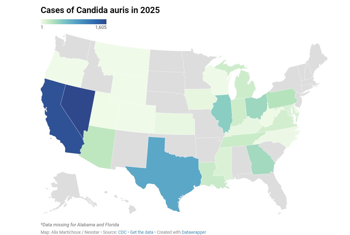 記者晨楓報導,美國疾病控制與預防中心(CDC)最新追蹤數據顯示,一種名為「耳念珠菌(Candida auris)」的致命抗藥性真菌正在全美 27 個州快速傳播,2025 年的感染人數已突破 7,000 人,逼近去年創下的歷史紀錄。其中,內華達州的感染率位居全美最高,引起當地衛生部門高度關注。