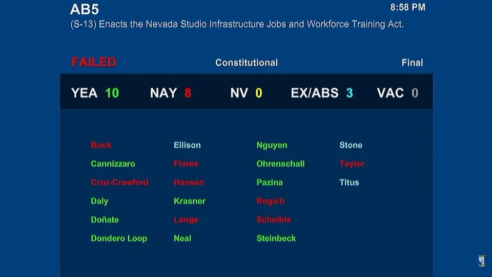 記者晨楓報導,一項旨在以稅收減免吸引電影製片廠進駐拉斯維加斯的法案,於週三晚間在內華達州參議院的投票中以10票贊成、8票反對、3票缺席的結果被否決,這項交易的失敗,暫停了短期內創造建築工作機會,以及長期內建立一個新興影視產業的努力。 這項被稱為「電影法案」的《內華達州製片廠基礎設施工作和勞動力培訓法案》(Assembly Bill 5, AB5),原計劃提供為期15年、
