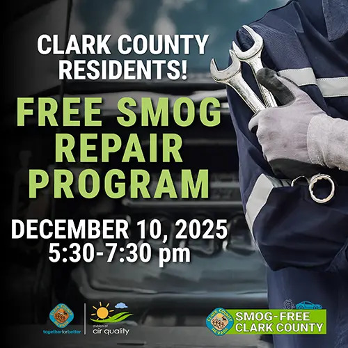 「本報記者致君報導」若您的老舊車輛因排放不合格而被迫停駛,現在有機會透過克拉克縣的「Smog Free Clark County」計畫獲得協助。該計畫將於 12月10日(週三)下午5時30分至7時30分,在 Durango Hills Community Center 舉辦免費對外開放的資訊活動,現場將為民眾說明如何申請最高 975 美元的車輛維修補助券,協助順利通過排放檢測。 「Smog Free Clark County」由克縣 空氣品質管理處(Divisio