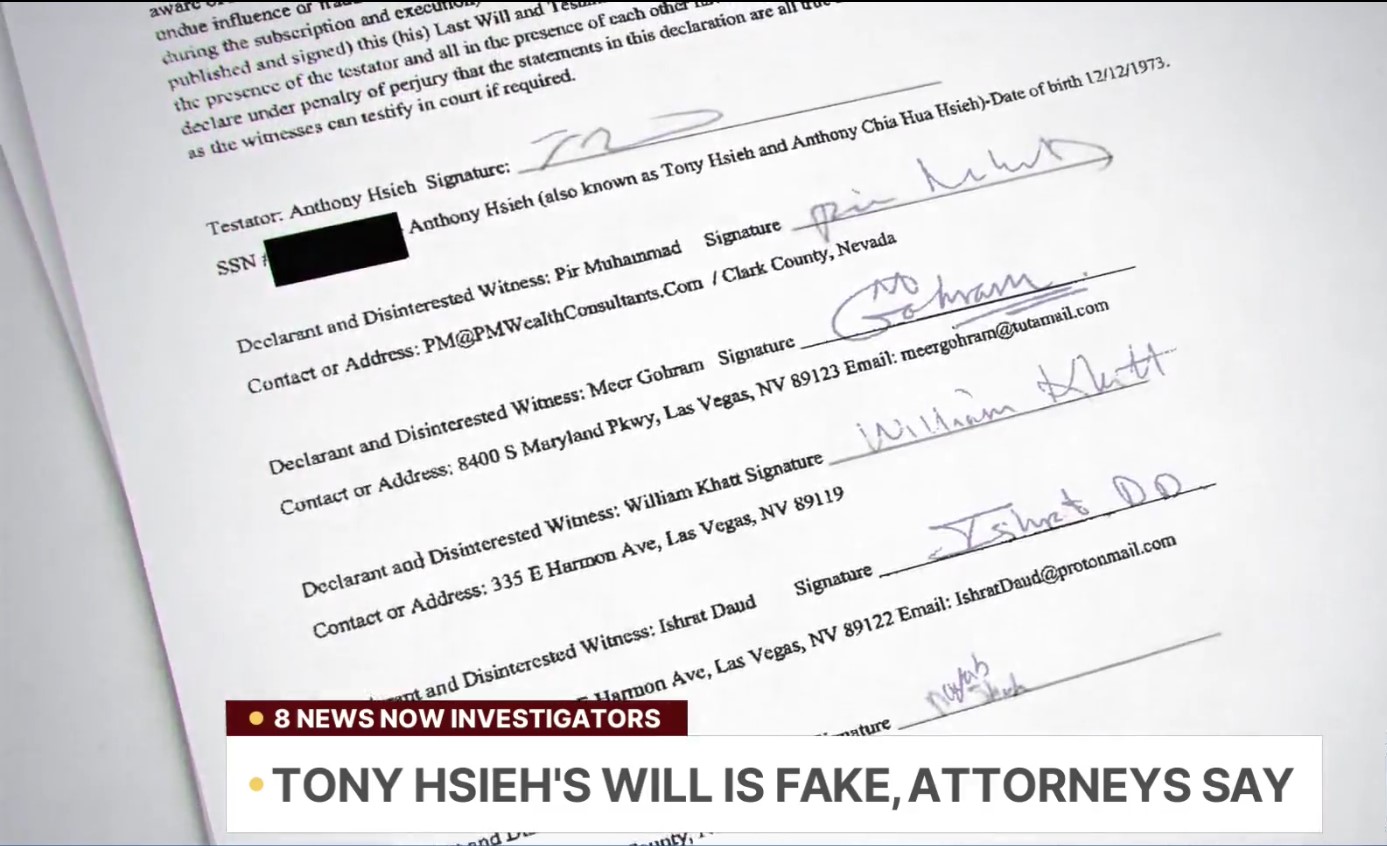 記者晨楓報導, 已故電商公司Zappos執行長、同時被譽為拉斯維加斯市中心振興功臣的謝家華(Tony Hsieh)的遺囑爭議,於本週一(15日)提交的法庭文件中出現重大進展。謝家華遺產的律師團聲稱,經過專家分析證實,這份於2015年提交的所謂「遺囑」上的簽名係屬偽造,且簽署文件上的其他見證人「並不存在」。