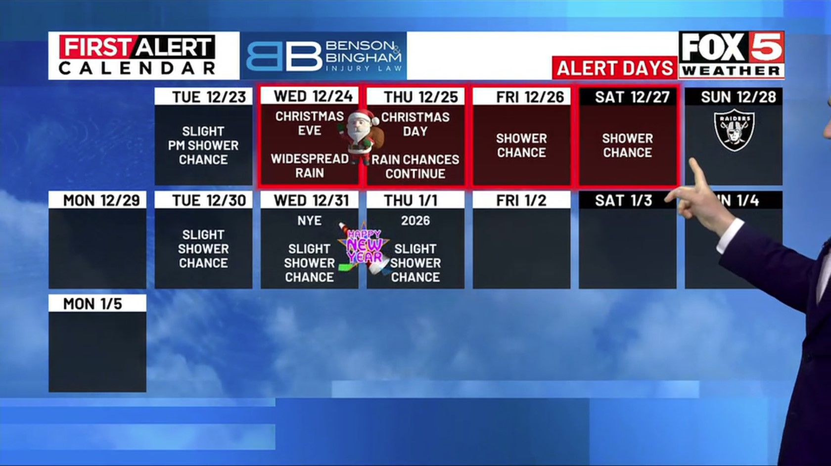 本週一拉斯維加斯維持了溫暖平靜的天氣,最高氣溫達 67 度,接近歷史紀錄。然而,從北加州南下的低壓槽正帶來充足水汽。氣象專家預測,聖誕夜當天的降雨機率高達 100%,且降雨將持續到聖誕節當天。