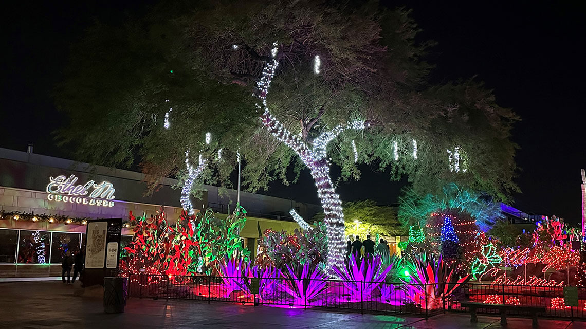 Ethel M 仙人掌花園: 展示超過一百萬盞彩燈,遊客可漫步在閃爍的沙漠植物中,享受招牌熱巧克力。