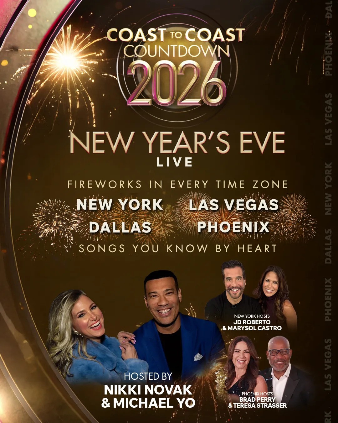 在山區時區,鳳凰城的 Gila River 度假村將由 Brad Perry 和 Teresa Strasser 帶領觀眾倒數。最後,焦點將回到拉斯維加斯大道,九家主要酒店將同步發射大規模煙火,慶祝 2026 年的降臨。