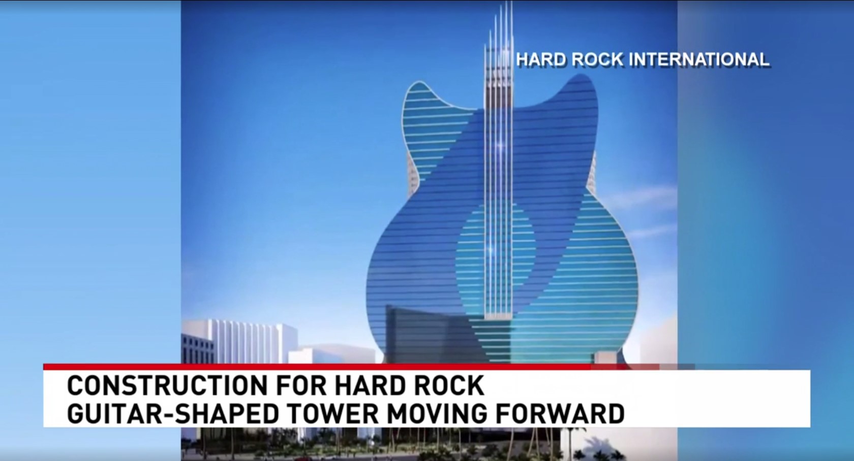 這座巨型吉他塔從渡假村走廊的兩端均清晰可見,外牆採用兩種不同色調的藍色玻璃帷幕牆,目前已安裝近12層。這項工程是硬石國際集團全面改造該地塊,打造維加斯硬石酒店及賭場計劃的重要一環。該計劃包括徹底拆除現有的三塔建築,並興建一座外型如公司標誌性吉他的巨型塔樓。