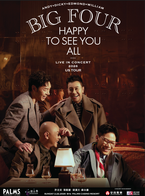 【本報記者李英訊】由 許志安、張衛健、梁漢文、蘇永康 組成的香港殿堂級男子組合 THE BIG FOUR,日前正式官宣世界巡演美西站行程,並確認將於今年2月登陸拉斯維加斯。消息發布後迅速引發港樂迷熱烈關注。 四位成員情同手足,縱橫樂壇逾三十載,各自擁有影響一代人成長的經典金曲;更因多年真摯深厚的兄弟情誼,被樂迷譽為「最具情感溫度的港樂組合」。此次不僅是 TH