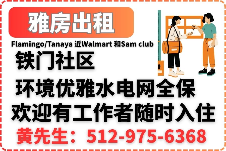 铁门社区 环境优雅水电网全保 欢迎有工作者随时入住 黄先生:512-975-6368 |