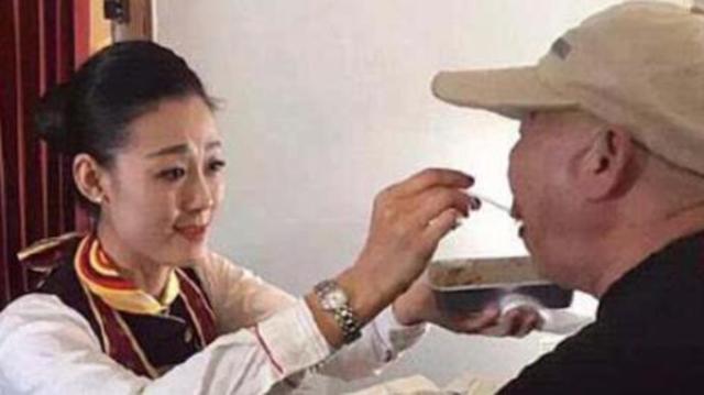 中國大陸一架河南省鄭州市飛往海南省的班機上,一名空姐跪著餵患有腦中風無法自己進食的老人用餐。老人被空姐感動的泣不成聲。