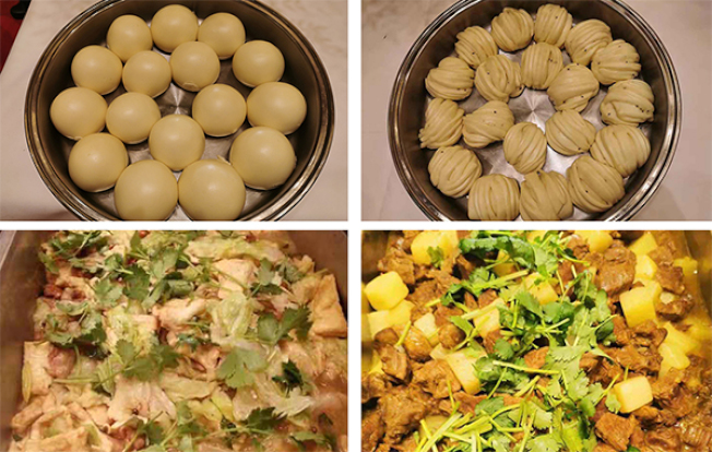 中國野戰炊事車端上的餐點,包括馬鈴薯燉牛肉、白菜燉豆腐、蒸饅頭、大花卷。