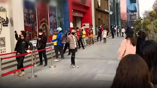 新冠肺炎疫情雖還在中國境內延燒,但各行各業已陸續復工,中國陜西及湖南傳出多間「網美手搖店」近日已復工,不但吸引大批顧客排隊,也讓全區的外送員「爆單」,場面非常壯觀;而店家也祭出「防疫對策」,規定每個顧客間都要保持距離、測量體溫及消毒。
