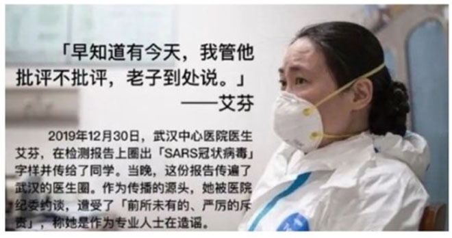 艾芬是武漢中心醫院急診科主任,2019年12月30日,她拍下一名不明原因肺炎(後定名為2019冠狀病毒疾病,俗稱武漢肺炎)病人的病毒檢測報告,並將其中「SARS冠狀病毒、綠膿假單胞菌」等字樣畫上紅圈,傳給自己的同學以及醫生群組,希望他們注意防範。