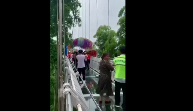 影片中,一群中國大媽跳得相當起勁,玻璃橋也隨著大媽們的舞動節奏強烈搖晃、震動,令人看了膽戰心驚。而身穿螢光綠背心的工作人員也前去阻止大媽們繼續跳舞,直呼「別跳了,沒看見橋要斷了?!」