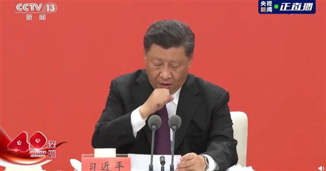 中共總書記習近平在深圳經濟特區成立40週年大會演說時,突然接連咳嗽,