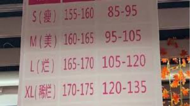 微博大V「搞笑迷惑大賞」11日上傳一張在中國大潤發賣場拍攝的女裝尺碼建議表照片,該表稱女生穿S號是「瘦」、M號是「美」,L、XL、XXL號卻分別標示「爛」、「稀爛」與「稀巴爛」。