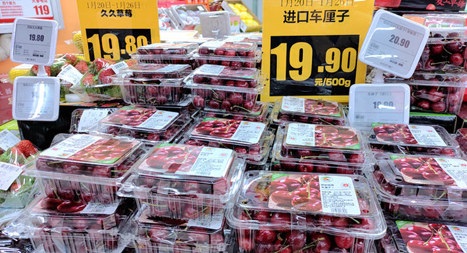 北京一家連鎖超市內,進口櫻桃正在促銷。