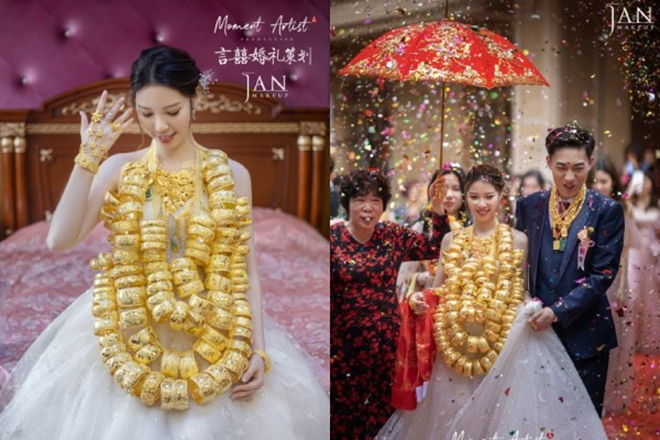 新娘戴「90個金手鐲」項鍊出嫁,這組照片引起網友們熱烈討論。