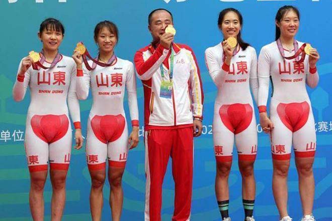 中媒報導,該項自行車女子團體追逐賽決賽,由山東代表隊贏得勝利,不過,當幾位女選手上臺領獎照片傳出後,不少網友對她們的服裝大感疑惑,只見她們的白色隊服在下腹部「一片紅」,看起來相當突兀。