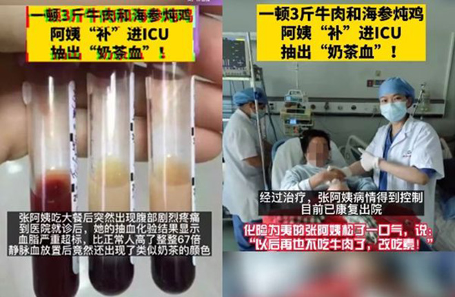醫生發現張女血脂嚴重超標也嚇了一跳,一問之下發現,張女因為覺得自己營養不夠,所以常常大魚大肉進補,長期下來身體終於吃不消。醫生表示,「病人當晚出現上腹部疼痛,檢查發現胰腺已經發炎水腫,會引發腹腔不適,嚴重的懷死性,甚至多重器官衰竭」。
