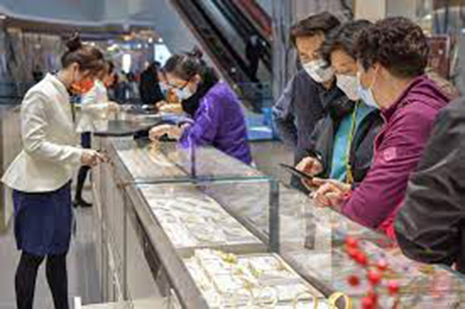 據報導,近日在中國最大的珠寶交易市場—深圳市水貝國際珠寶交易中心,場內人流絡繹不絕,部分金鋪再現顧客排隊買單的盛況。