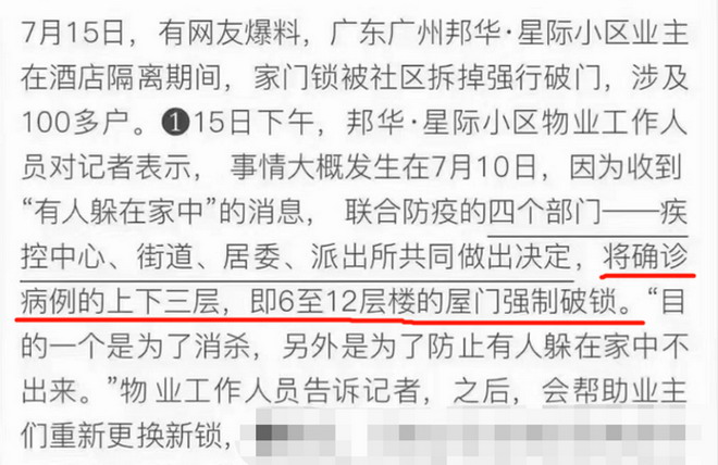 15日下午,有記者致電邦華·星際社區物業,工作人員表示,事情大概發生在7月10日,因為收到“有人躲在家中”的消息,聯合防疫的四個部門--疾控中心、街道、居委、派出所共同做出決定,將確診病例的上下三層,即6至12層樓的屋門強制破鎖。“目的一個是為了消殺,另外是為了防止有人躲在家中不出來。”物業工作人員告訴記者,之後,會説明業主們重新更換新鎖,“目前,整棟樓也只有穿著防護服的抗疫人員才可以上去。”