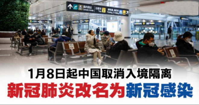 中國政府週一(12月26日)晚間宣佈,自2023年1月8日起,將取消入境人員的全員核酸檢測及集中隔離措施,並將傳染病管制層級由“乙類甲管”下調為“乙類乙管”,因此國內新冠感染者也將無須進行隔離。
