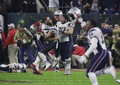 職業美式足球NFL新英格蘭愛國者(Patriots)今天在第51屆超級盃上演戲劇性逆轉秀,下半場後來居上邁入延長賽,終場34比28擊敗亞特蘭大獵鷹(Falcons),勇奪隊史第5座冠軍。