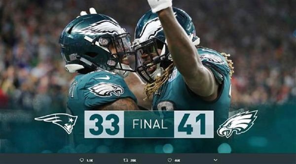 第52屆職業美式足球NFL超級盃登場,費城老鷹(Eagles)終場41比33擊敗新英格蘭愛國者(Patriots),勇奪隊史首座超級盃冠軍。