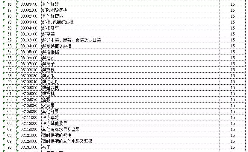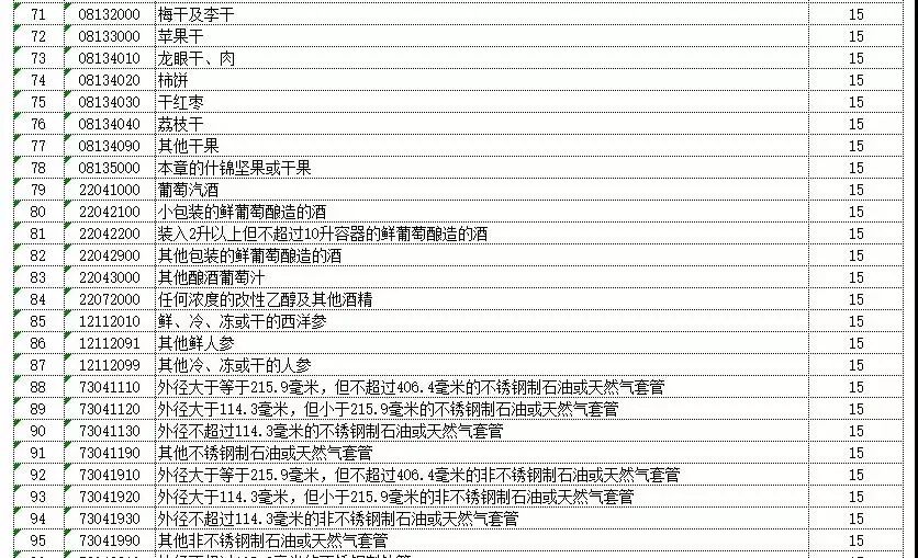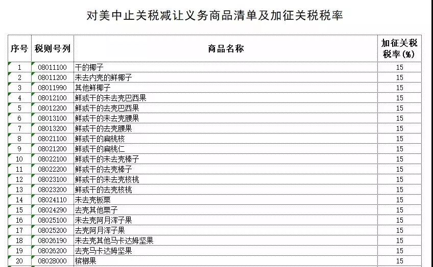 中國財政部指出,在現行適用關稅稅率基礎上加徵關稅,對水果及製品等120項進口商品加徵關稅稅率為15%,對豬肉及製品等8項進口商品加徵關稅稅率為25%。現行保稅、減免稅政策不變。