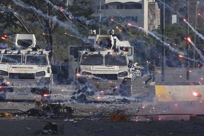安全部隊試圖驅散空軍基地外的示威民眾。委內瑞拉反對派領袖瓜伊多稍早在基地外呼籲基地裡的部隊加入推翻馬杜洛的行列。