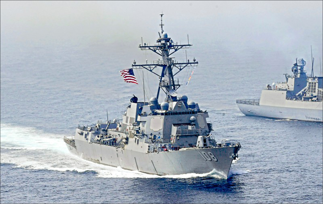 美國海軍伯克級飛彈驅逐艦「邁爾號」(USS Wayne E. Meyer,左)二O一七年四月與南韓海軍舉行聯合演習。