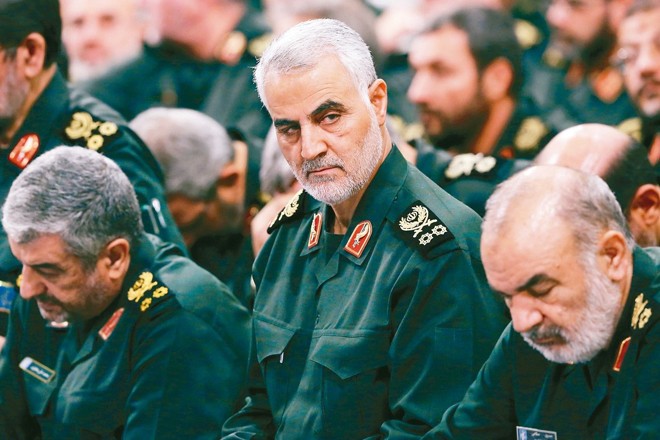 遇襲身亡的伊朗革命衛隊「聖城部隊」指揮官蘇雷曼尼將軍(中)。