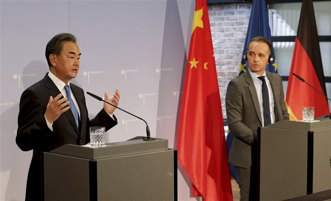 「付出沉重代價」,德國外長馬斯(右)與王毅共同出席聯合記者會時予以反擊。
