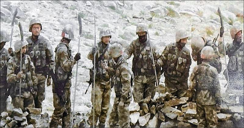 中國士兵持長柄大砍刀、矛、棍棒,逼近位於湖南岸山脊線上的印度哨站。