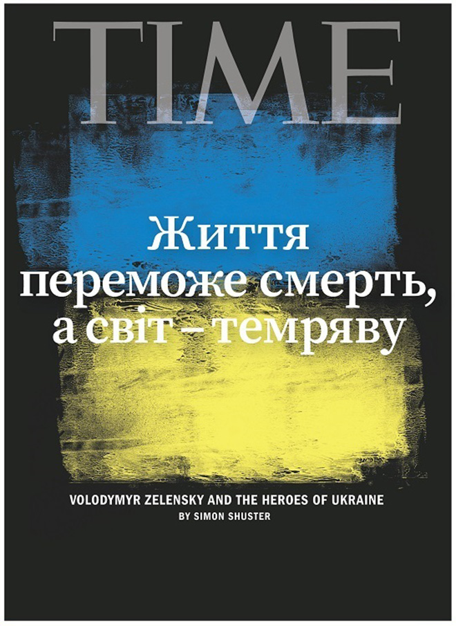 《時代雜誌》(Time)公布最新一期封面,封面染上代表烏克蘭的藍黃色,標題打上「澤倫斯基與基輔的英雄」,並以烏克蘭語寫道「生命終將戰勝死亡,光明終將戰勝黑暗」,這句話是澤倫斯基1日在歐洲議會發表視訊演說的名言,這場演說感動世界,演說結束後,歐洲議員們紛紛起立為其熱烈鼓掌。