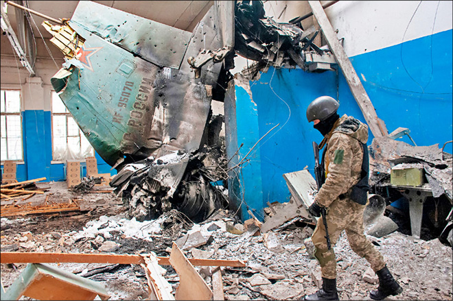 烏克蘭軍隊檢視一架被擊落的俄羅斯蘇愷-34戰鬥轟炸機尾翼殘骸。
