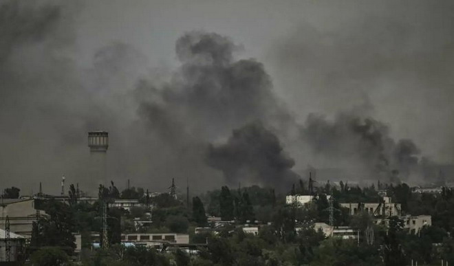 (綜合報導)烏克蘭東部頓巴斯地區的西耶羅多涅茨克市2022年6月2日在炮火下。