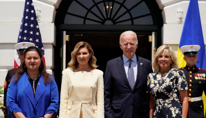 拜登、夫人吉爾、烏克蘭第一夫人奧萊娜·澤連斯卡婭、烏克蘭駐美大使奧克薩娜·瑪律卡羅娃在白宮合影
