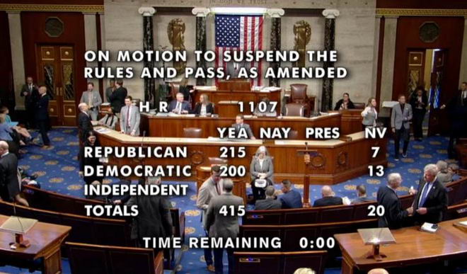 計票結果顯示,有215位元共和黨議員投贊成票,7人未投;200位民主黨議員投贊成票,13人未投;無人投反對票。