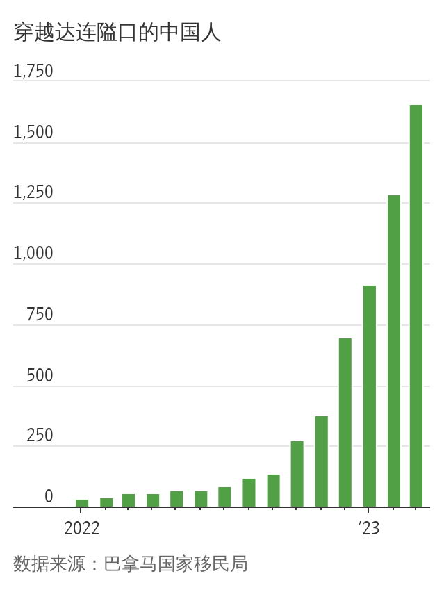 今年1-3月份,有3,855名中國移民穿越了連接南美洲和中美洲的達連隘口(Darien Gap),這是一個長約60英里的險峻地帶。根據巴拿馬的移民資料,相比之下,2022年全年此類中國移民人數為2,005人,而2010年至2021年間只有376人。資料顯示,今年1-3月份,中國人是從哥倫比亞穿越達連隘口的第四大人群。