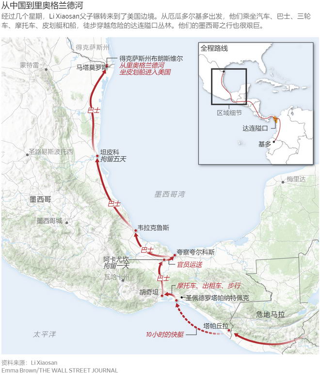 中國偷渡者說,像Huang嘗試的這種長途跋涉的偷渡路線所需費用在7,000美元到1萬美元不等,包括蛇頭費、交通費和住宿費。這些偷渡者說,更直接和更安全的偷渡路線現在的價格不低於6萬美元,比如飛往墨西哥,在那裡由蛇頭“代理人”賄賂海關官員,讓中國人用偽造的旅行證件入境。