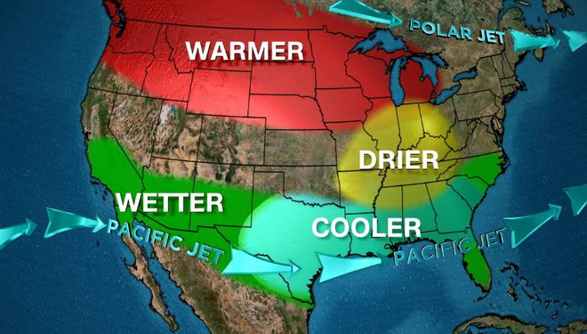 沒有兩個厄爾尼諾的冬天是完全相同的,但具有共同的溫度和降水趨勢。其中一個主要原因是急流的位置,它經常在冬季向南移動。美國國家海洋和大氣管理局稱,這種轉變通常會給南方帶來更潮濕、更涼爽的天氣,而北方則變得更乾燥、更溫暖。