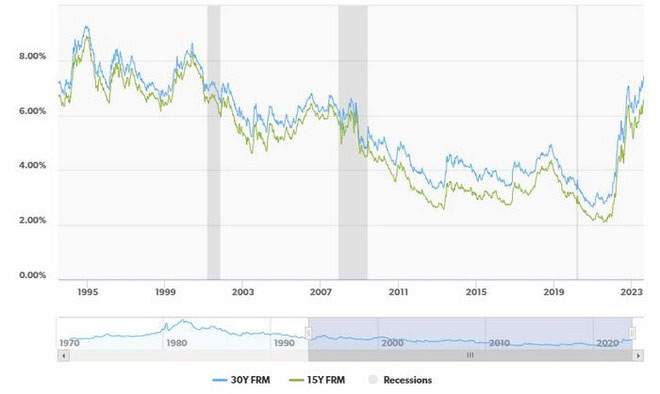 10月5日(週四),房地美(Freddie MAC)MCC公佈的資料顯示,截至10月5日,30年期固定利率抵押貸款的平均利率為7.49%。抵押貸款利率本周比前一周上升18個基點。一年前,30年平均值為6.66%。