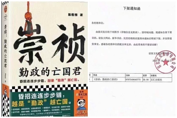 (綜合報導)10月16日(週一),網傳一份《崇禎:勤政的亡國君》下架通知函引發全網關注。目前,此書微博資訊被清空,大陸各大網售平臺都已找不到這本書。此書已在各大網站、新華書店、民營書店全面下架。