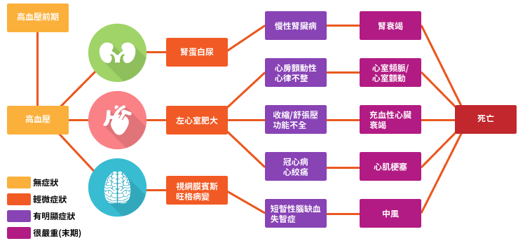 高血壓的重要性就在於,它會引發全身多處器官併發症,包括心臟、腎臟、腦部、血管組織等,且高血壓的嚴重程度也會影響併發症發生早晚與嚴重程度。