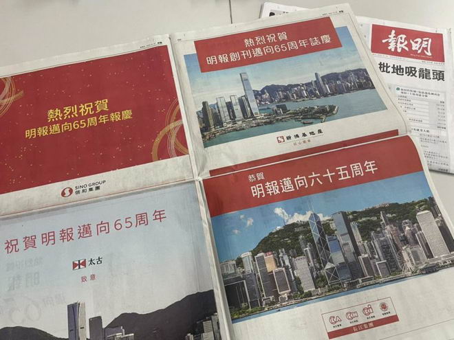 (綜合報導)5月20日是香港大報《明報》創辦64周年紀念日。香港各界19日在《明報》刊登了33版慶賀廣告,購買廣告版位的機構包括長江集團、新鴻基、太古、信和、恒基、嘉華、華懋、房協、各大銀行、麥當勞等。慶賀廣告用詞都是“邁向65周年”。