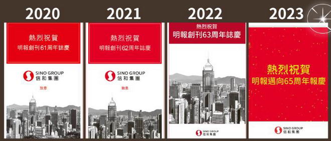“光傳媒”刊登的照片顯示,《明報》前幾年刊登的周年慶廣告都是直接寫“祝賀明報創刊61周年”“創刊62周年”“創刊63周年”,今年一改風格,變成了“邁向65周年”。