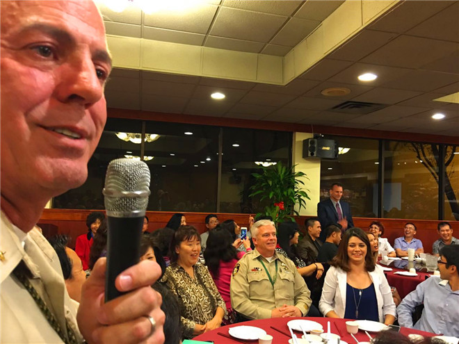 席間由AAG會長Mike Savani 代表歡迎並感謝警長Joe Lambada 的關注亞裔社區治安問題,這幾個月來警察機關加強對於亞裔商業區的安全措施 ,成績斐然大家有目共睹,有口皆碑。