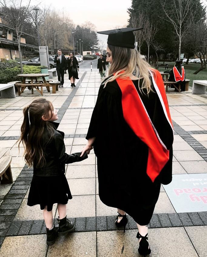 【綜合報導】英國現年21歲的女子坎佩(Rachael Campey),因14歲時意外懷孕而遭到退學,但她卻沒有放棄升學,15歲產下女兒後,她同時兼任多份工作,並透過多間教育機構學習;於近日順利取得大學學位後,她帶著6歲的女兒一同出席畢業典禮,受到全場熱烈掌聲的她,既感動又驕傲。